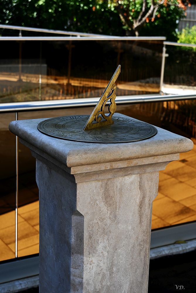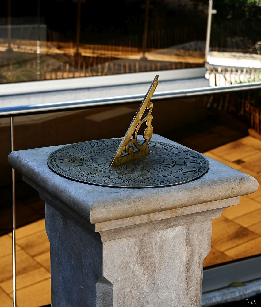 Napóra: horizontális, 218 mm átmérőjű, helyi időt mutat. Számlapja: V-XII-VII, öt perces kiosztással. Anyaga: sárgaréz (polírozott, matt vagy antikolt). Talapzat: fagyálló mészkő talapzat (négyzet).